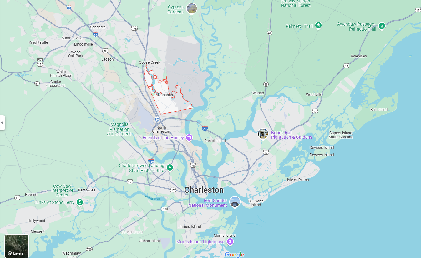 - Proximity: 25 minutes north of Downtown Charleston and sandwiched between Summerville and Goose Creek.
